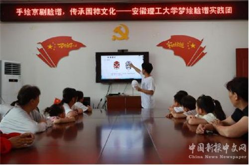 志愿者在明光市赵府社区青年之家为学生开展京剧脸谱知识科普