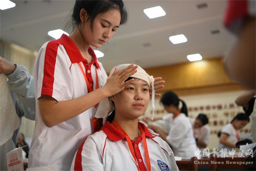 2023年8月31日,贵州省凯里市红十字会开展应急救护技能集训,学生在练习包扎技能。(杨仁海 摄)