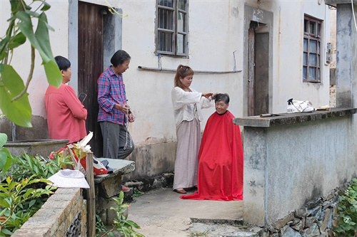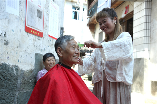 9月11日,在黄山市区开理发店的方伟美驱车100多公里来到休宁县鹤城乡朱家坑村为村里的老人义务理发。