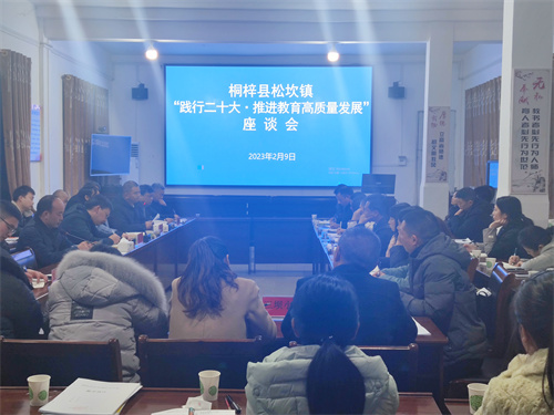 2023年2月9日,松坎镇召开“践行二十大 推进教育高质量发展”座谈会。镇党委副书记、镇长邓勇,分管副镇长杨丽出席会议,会议邀请桐梓县第二责任督学区督学参会指导,松坎镇教育党总支书记、中心学校校长廖良志,中心校办公室全体人员,各教研组组长,各校(园)长、中层领导、语文、数学学科教师参加座谈。