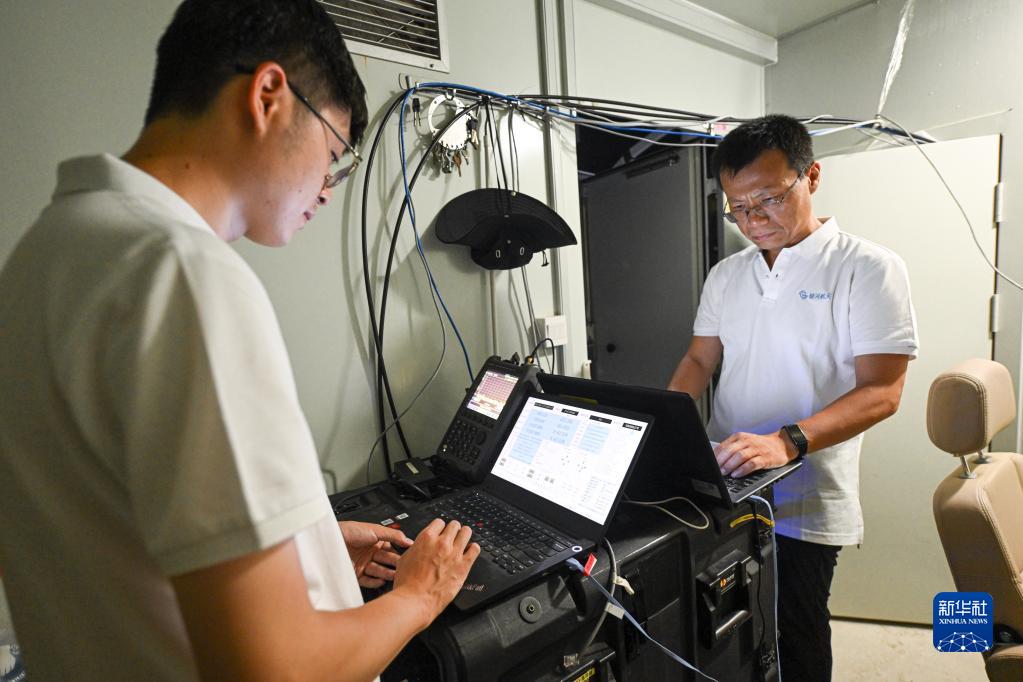 远海测试开始前,工作人员在位于海南省陵水黎族自治县的低轨信关站调试设备(6月13日摄)。在此次测试中,该信关站用于接收远海回传数据。