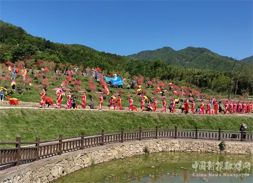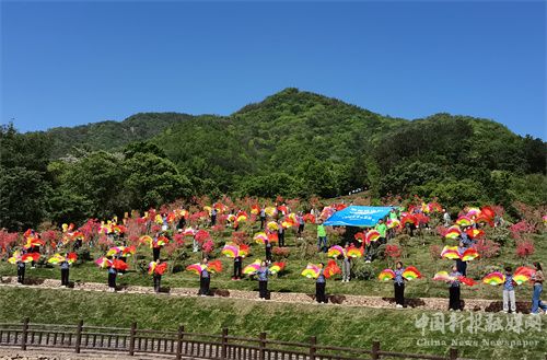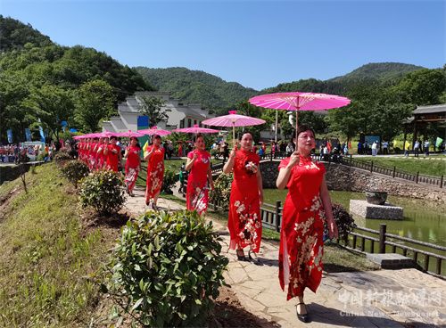 2023年5月1日,蓝天丽日,清风徐徐,安徽省合肥市庐江县柯坦镇牛王寨主峰下,采茶姑娘手舞彩扇,旗袍队伍整齐走秀,欢迎八方游客前来攀登牛王寨。