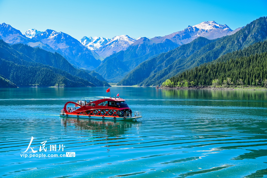 进入6月,新疆昌吉回族自治州天山天池风景区湖水晶莹澄澈,四周群山环抱、绿草如茵。一幅人在山中走,如在画中游的美景映入眼帘,优美的景色,吸引不少游客。陶维明摄(人民图片网)