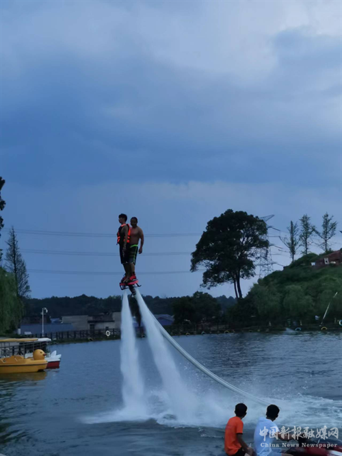 7月3日,当夕阳收起余光时,位于浏阳石柱峰下的乐钓山水山庄各式彩灯绽放缤纷的光芒,青山粉黛、柳树成荫,游船在五光十色的湖水中荡漾。随着阵阵喝彩声,水上飞人娱乐项目开始了,只见特技演员脚踩喷气滑轮,呼的一下,从水面冲向空中,翻转着跟斗,嘭的一声潜入湖底,有两个演员相互配合默契,在空中表演雄鹰飞翔,动作轻柔、舒展、流畅。水上表演,惊险不断,掌声不断,高难动作刺激着游客的每一根感官神经。在光影重重的湖岸上,洁白穹顶式的多功能演艺厅宾客满座。他们吃着烧烤,品着啤酒,喝着当地茴香茶,兴高采烈地观赏文艺节目。激情难抑时,游客们会自告奋勇融入氛围,参加节目表演,忘了年纪,忘了身份 。