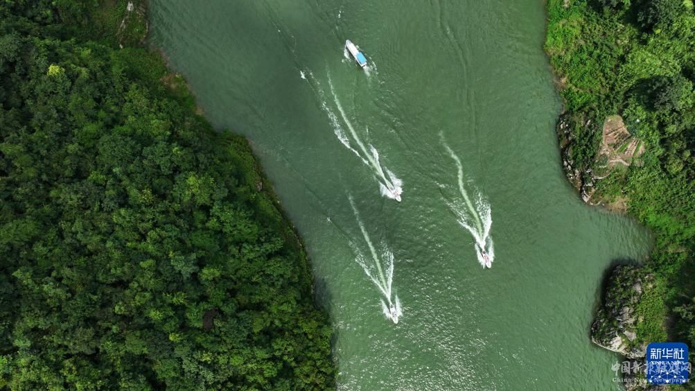7月11日,游客在贵州省遵义市播州区楠木渡景区乘快艇游览(无人机照片)。