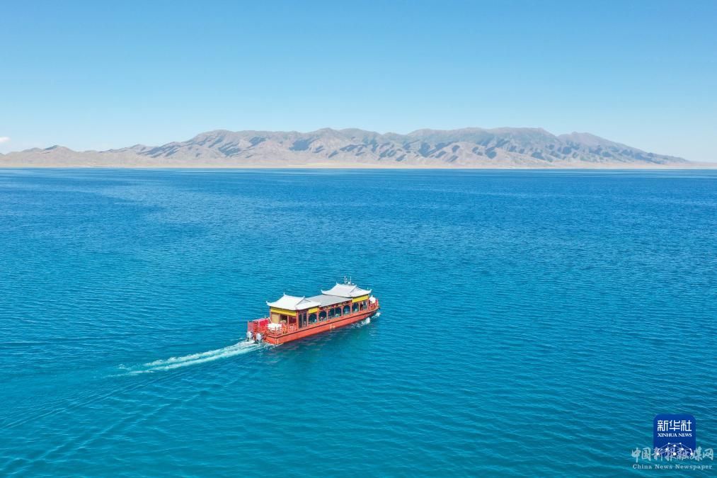 7月25日,游客乘坐游船在新疆赛里木湖游览(无人机照片)。