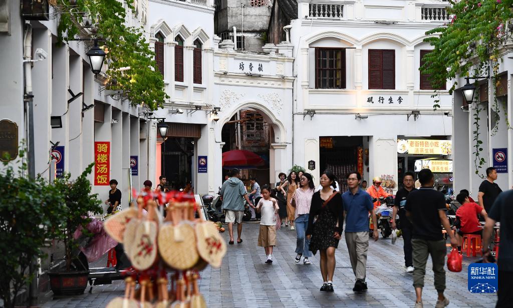 游客在海口骑楼老街参观游玩(8月21日摄)。