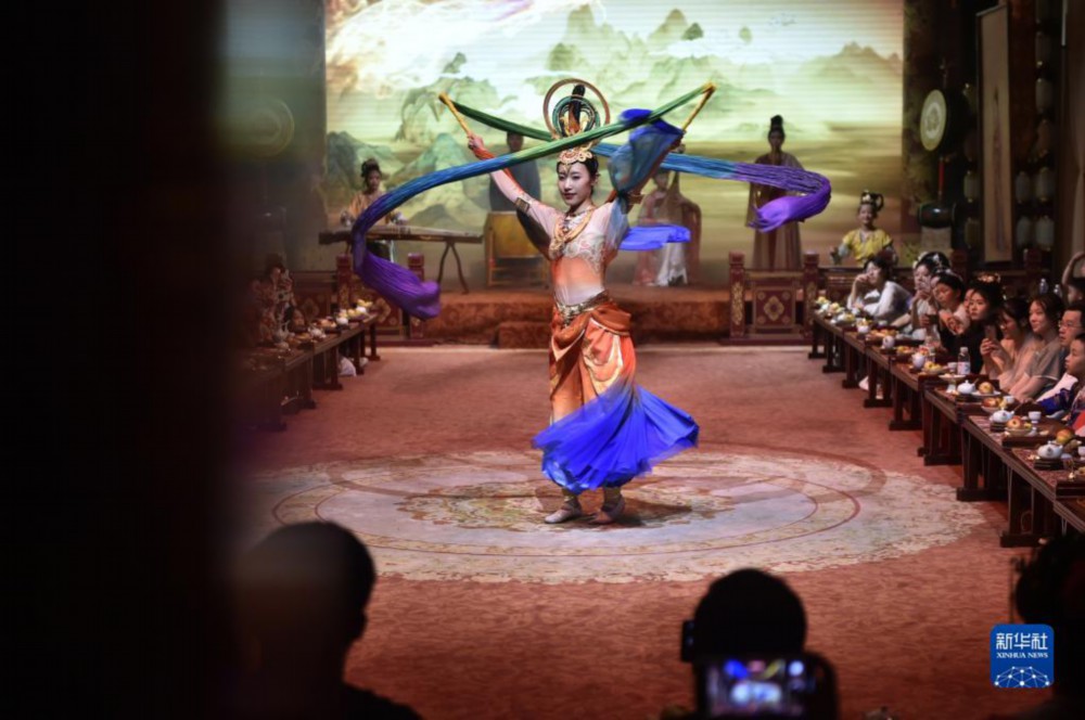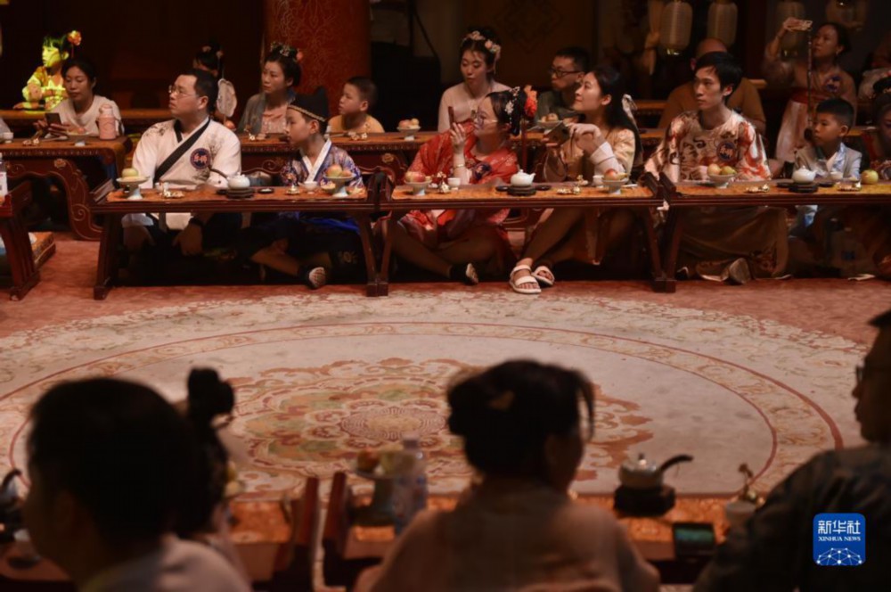 8月11日晚,游人在洛阳应天门遗址博物馆内观赏演出。
