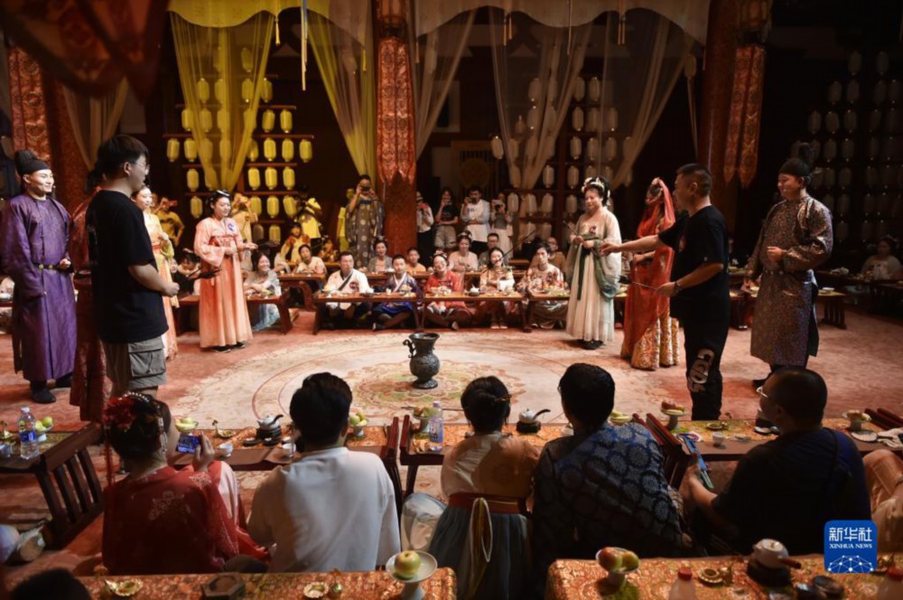 8月11日晚,游人在洛阳应天门遗址博物馆内和演员参加互动游戏。