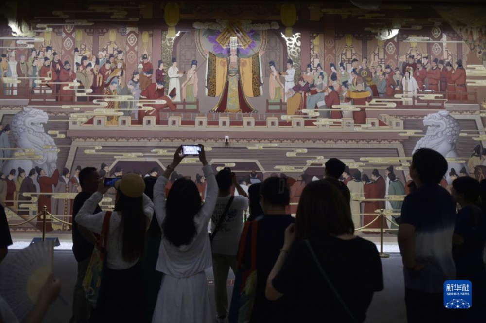 8月11日晚,游人在洛阳应天门遗址博物馆内观赏壁画。