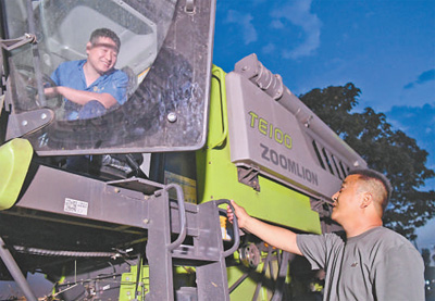 镜头故事·抢收小麦 今年夏天,小麦产量约占全国1/4的河南遭遇“烂场雨”。6月7日晚,河南安阳市滑县袁营村党支部书记吴东星(右)和农机手沟通抢收小麦的注意事项。这天夜晚,4台收割机要完成村里300亩麦田的抢收任务。 新华社记者 张浩然摄