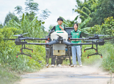 镜头故事·返乡创业 9月13日,广东广州市增城区石湖村,90后“新农人”沈笑芬(右)操作农用无人机起飞。2018年,沈笑芬毕业后返乡创业,加入石乡农机专业合作社,带领农机团队盘活利用3000亩闲置田地,带动周边4个村庄村民年增收超120万元。 新华社记者 邓 华摄