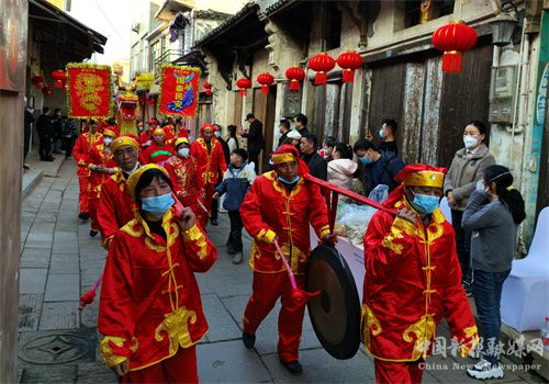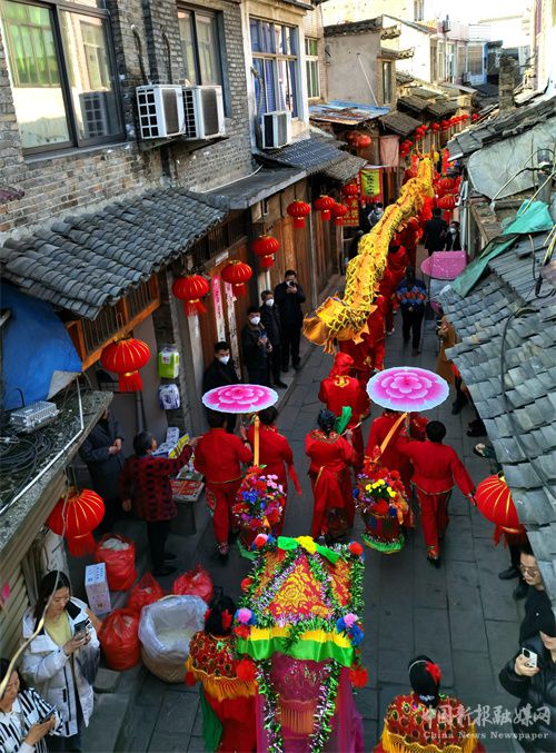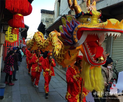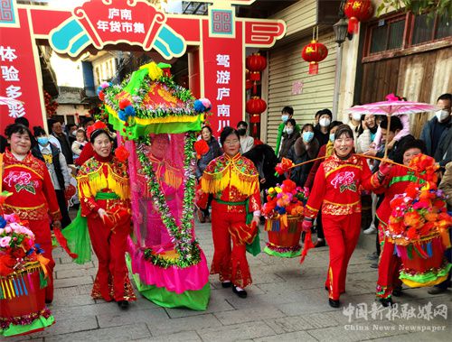 2023年1月8日,安徽省合肥市庐江县龙桥镇黄屯老街上,舞龙灯、踩旱船等当地传统的民俗表演为最近举办的庐南年货市集增添了丰富的文化气息和浓浓的年味,吸引了八方游客前来一饱眼福。