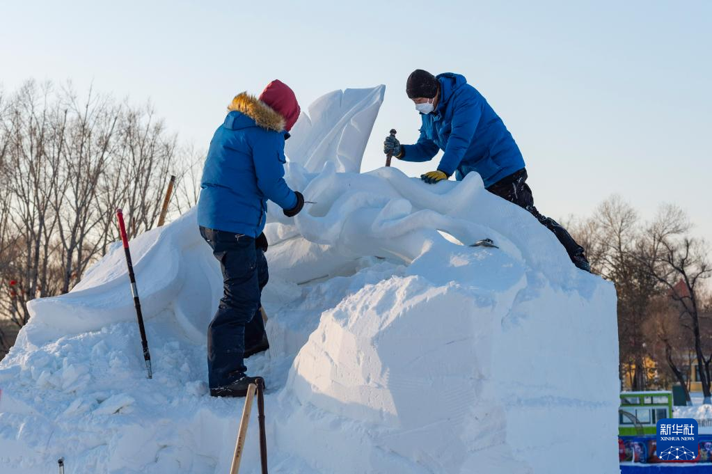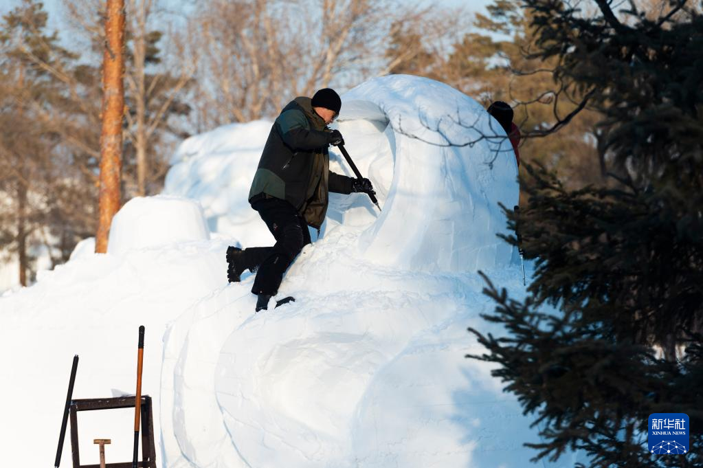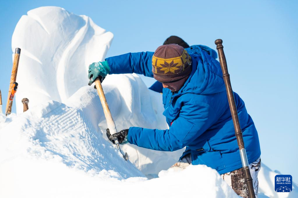 1月10日,在哈尔滨太阳岛雪博会园区,参赛选手进行雪雕创作。新华社记者 谢剑飞 摄