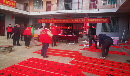 1月12日,新宁县新时代文明实践中心、县文旅广体局、县文联、县图书馆、橙星书屋在黄龙镇沉水村联合开展“我们的中国梦•湖湘文化进万家”“我们的节日•春节”2023年迎新春送福送春联送智慧惠民活动。