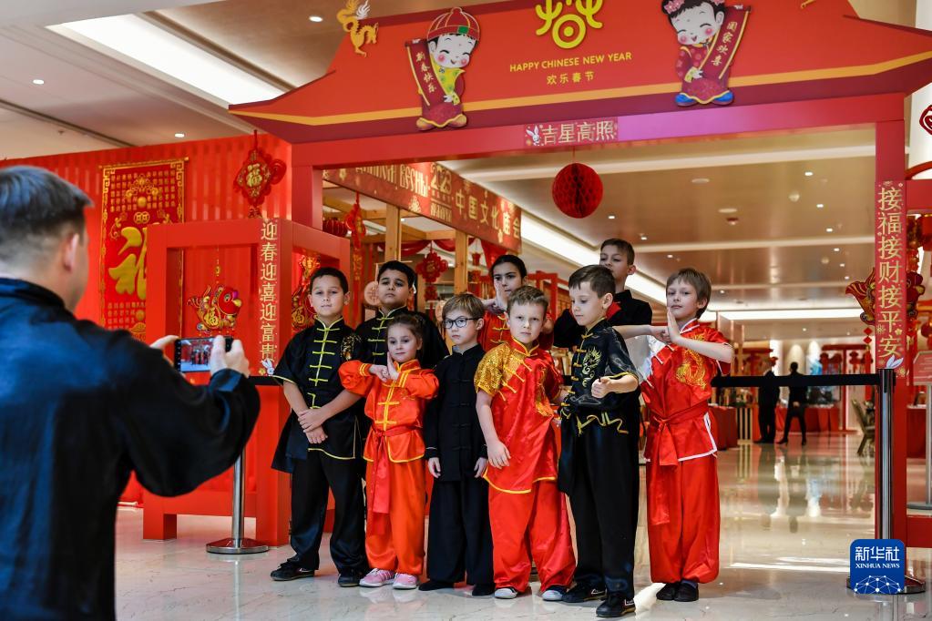 1月20日,在俄罗斯莫斯科,参加“欢乐春节—中国文化庙会”活动的小朋友合影留念。