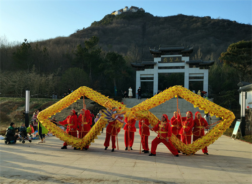 2023年1月28日,位于安徽省合肥市庐江县乐桥镇大化村的岱鳌山主峰龙王顶山下,城乡各地的草根艺术团正在表演传统民俗非遗节目舞龙灯和花鼓唱。