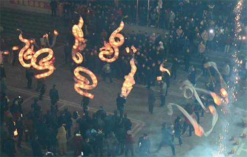 当天晚上7时许,在金南社区的街道上,油龙经过祭祀后,拉开了当夜闹腾新春的序幕。在漆黑的夜色中,6条高高的油龙蜿蜒前行,2条长长的滚龙上下翻滚,似流星疾划夜空,像火龙凌空当舞。千姿百态的龙灯,让当地的夜空异常璀璨。油龙高大威武,连夜“走访”家家户户,为商家店铺和机关单位送上吉祥和祝福。场面十分热闹喜庆、非常壮观。不少群众一边驻足观赏,一边用手机拍摄图片和视频迅速上传,与大家分享游龙的喜乐,成为网红龙灯。