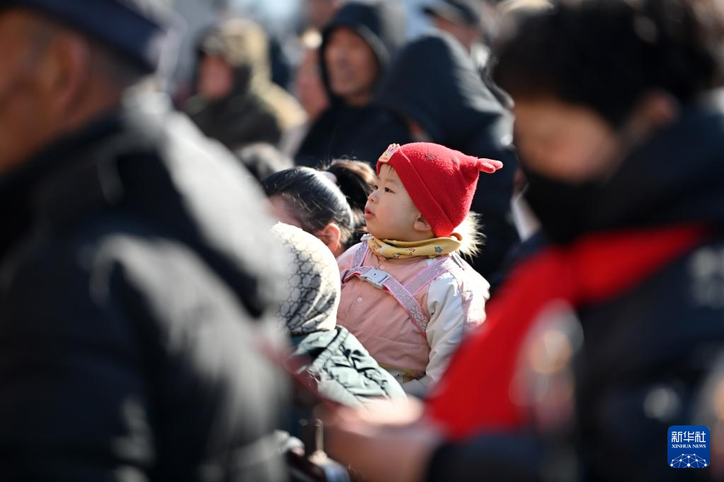 1月30日,在山西省太原市清徐县孟封村,一名小朋友在观看太原市晋剧艺术研究院实验二团演员演出。