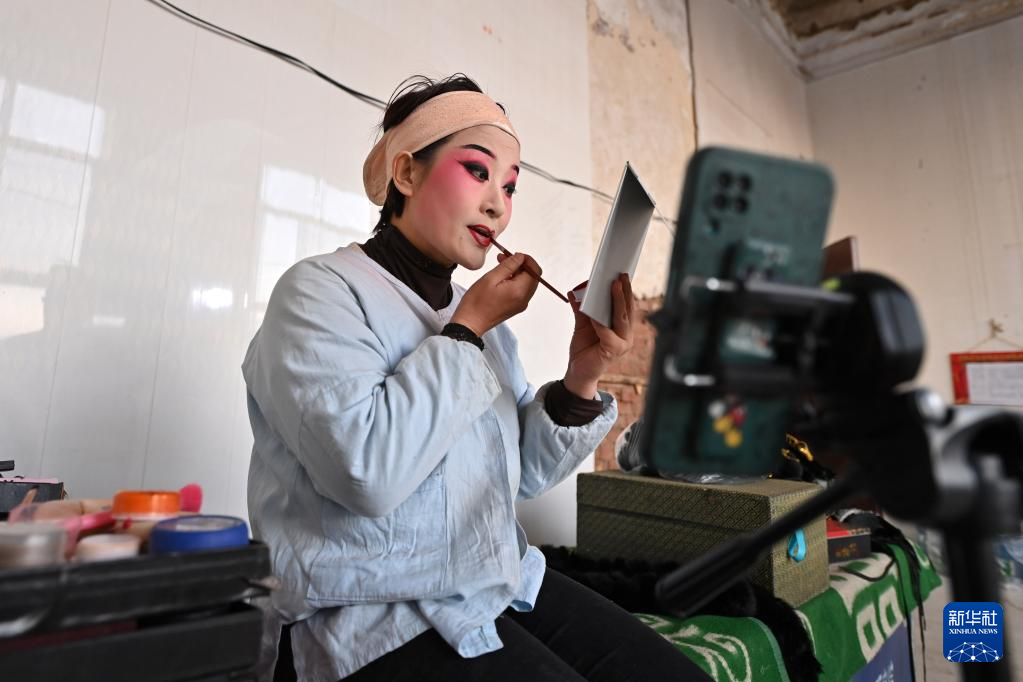 1月30日,在山西省太原市清徐县孟封村,太原市晋剧艺术研究院实验二团演员在后台直播化装。