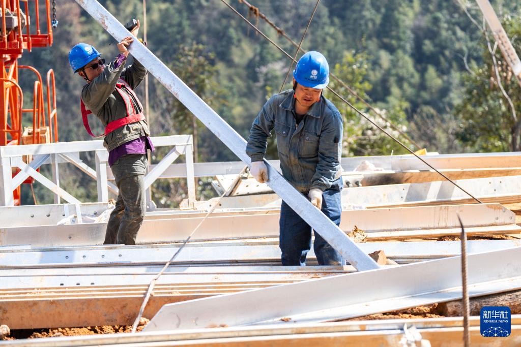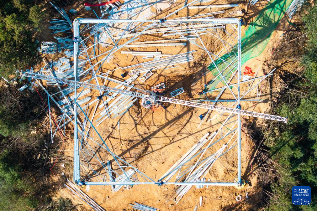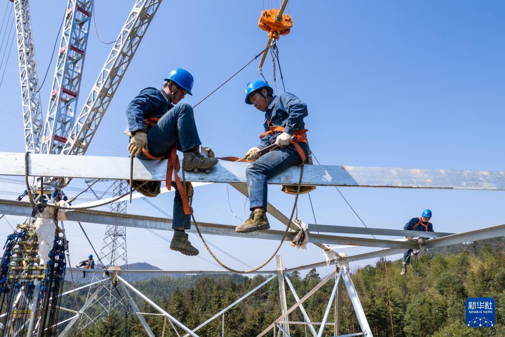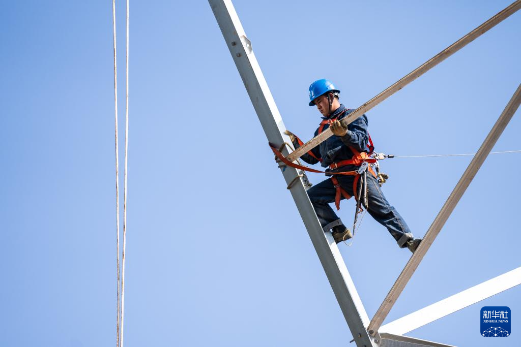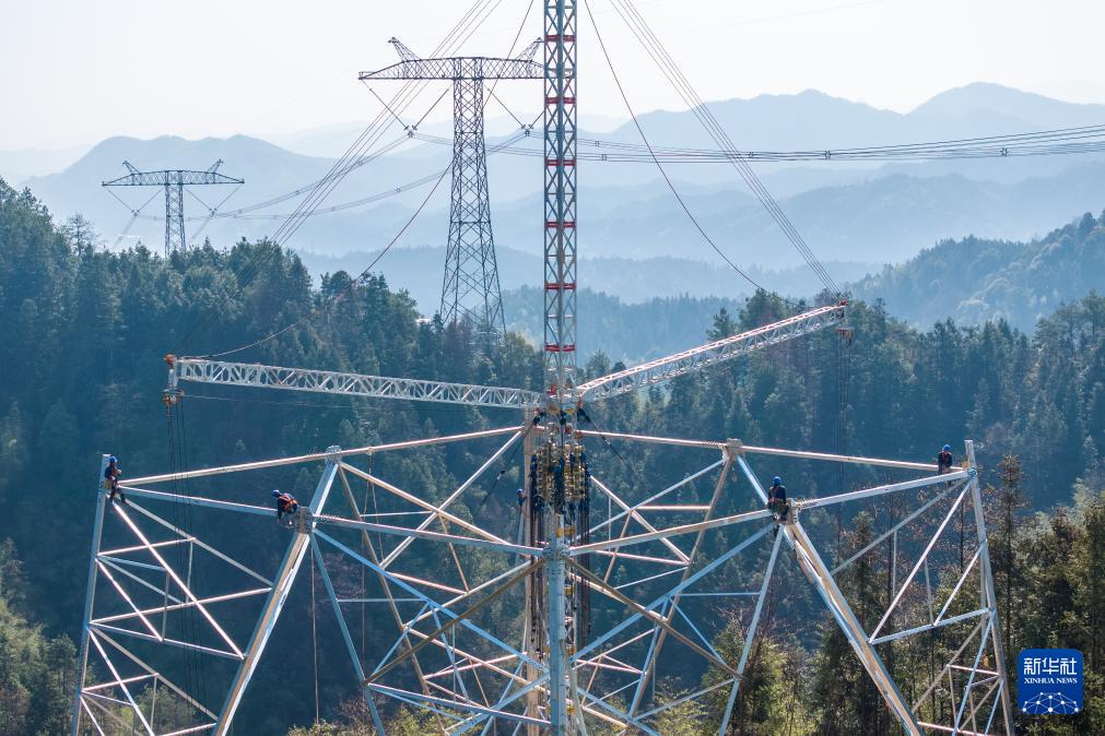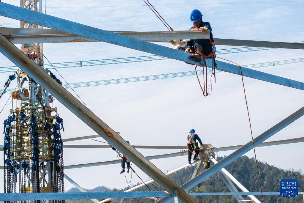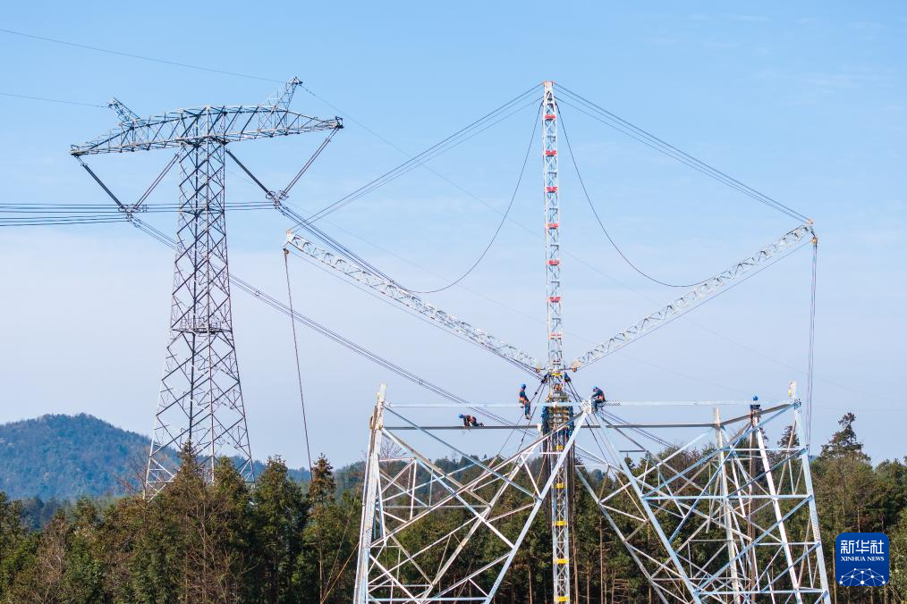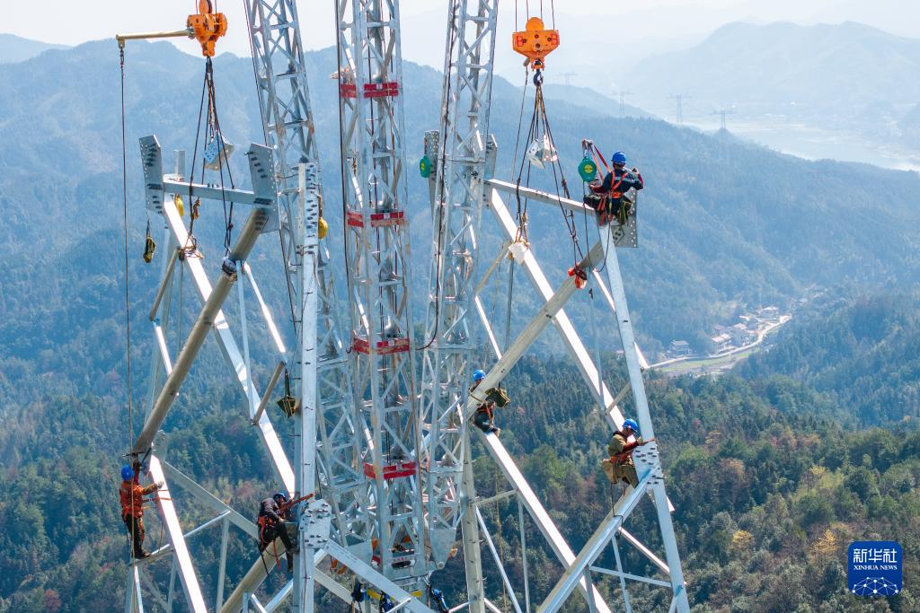 当日,在湖南省益阳市安化县冷市镇,湖南省送变电工程有限公司电力工人抓紧推进“宁电入湘”工程组塔工作,力争项目早日建成运营。
