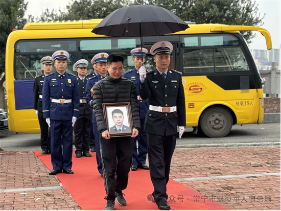 暖阳高照,警笛声声。上午9点20分,在常宁市殡仪馆,公安干警整理灵柩,为徐斌烈士遗骸盖国旗,并一路护送。30分钟后,车队缓缓驶入烈士陵园内。青山翠绿,松柏环绕,革命烈士纪念碑高高耸立,参加祭奠的公安、交警、退役军人、学生、烈士家属代表队列肃立,向烈士默哀致敬,表达深切缅怀。
