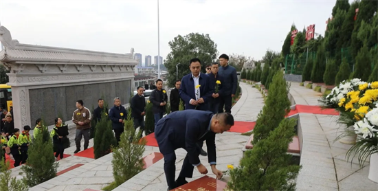 伴随着深沉的《思念曲》,干警们手捧覆盖中华人民共和国国旗的烈士灵柩,迈着铿锵步伐,护送烈士灵柩到墓位安葬;副市长曹阳致悼词;全体人员排队依次向烈士敬献鲜花,表达深切哀思和无尽思念之情,祭奠烈士不朽英魂。