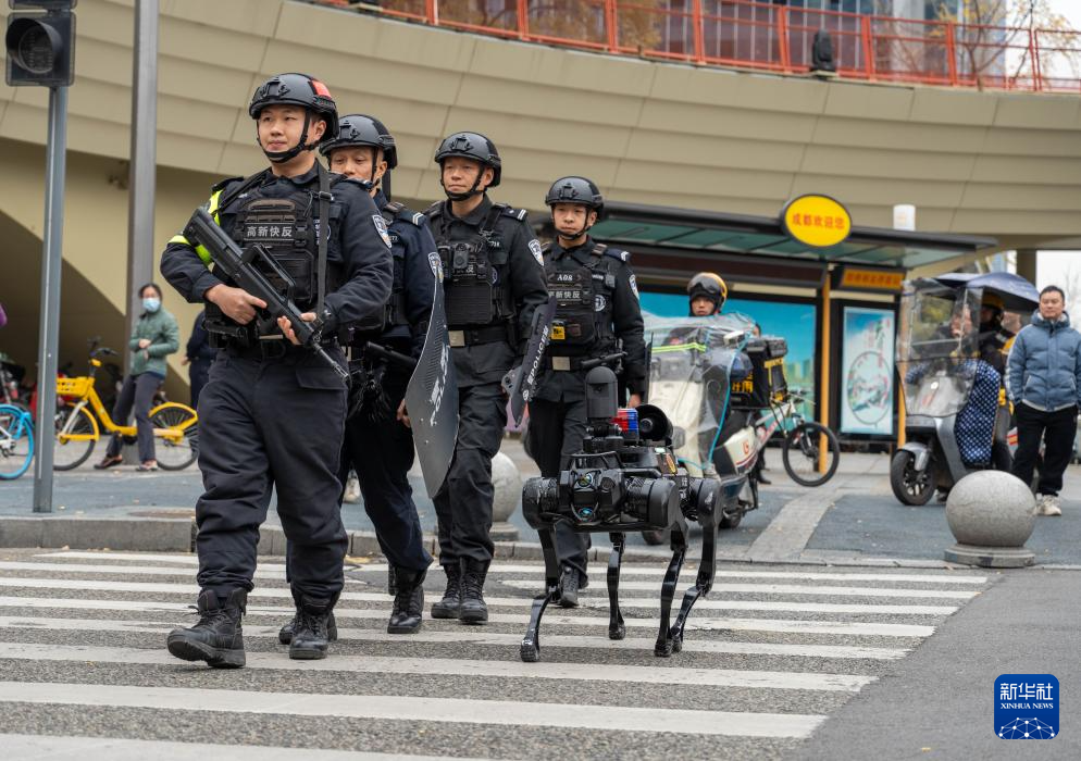 12月13日,成都市公安局高新分局巡逻大队警员和机器狗在街面巡逻。