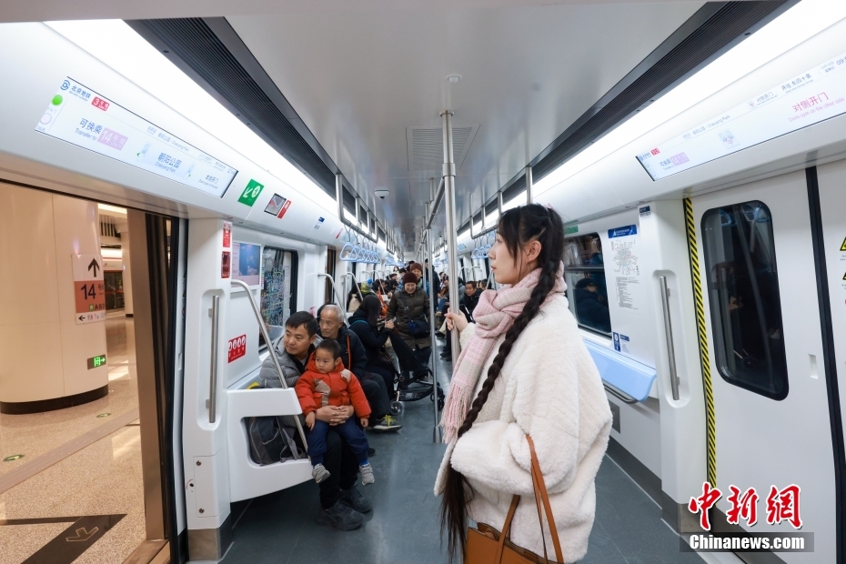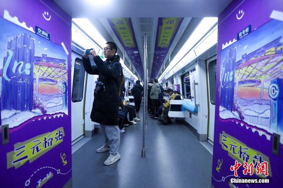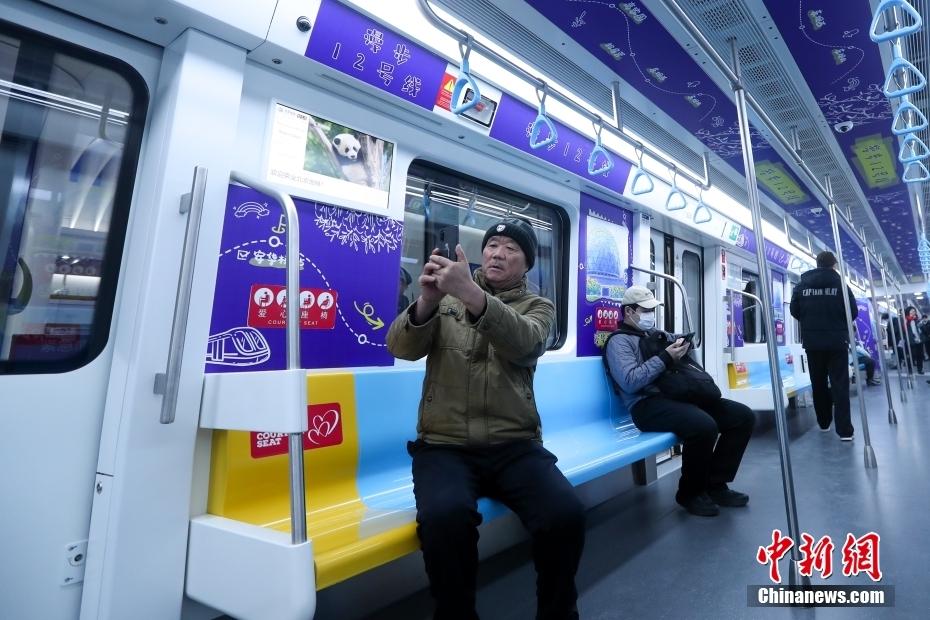 12号线首班车乘客在主题车厢内拍照。