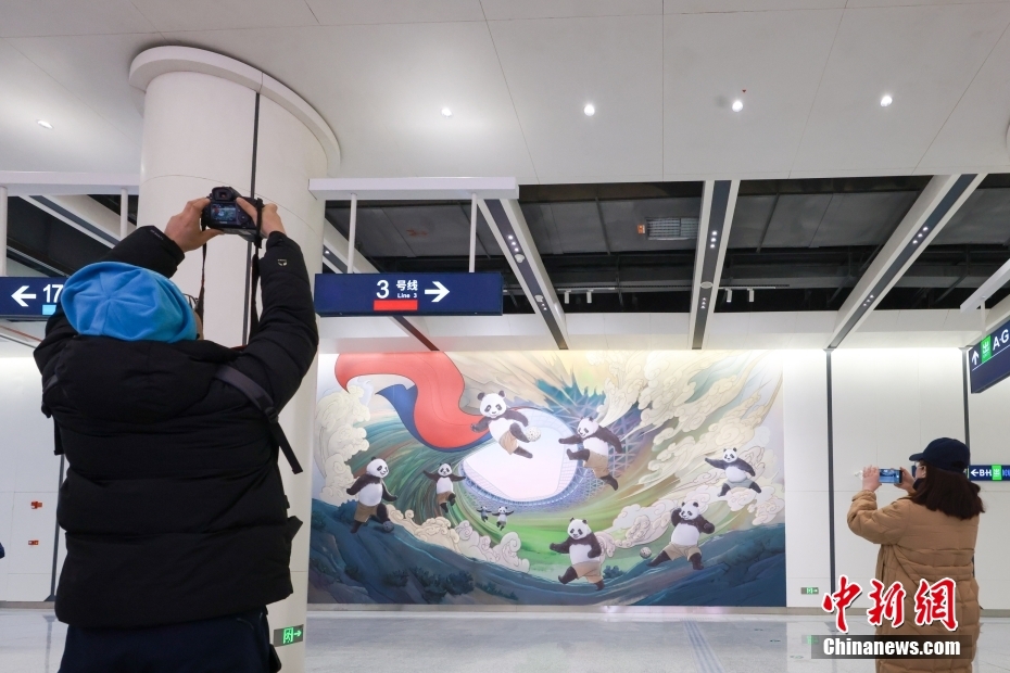 北京地铁3号线团结湖站内,印有北京CBD地标建筑的壁画吸引乘客。