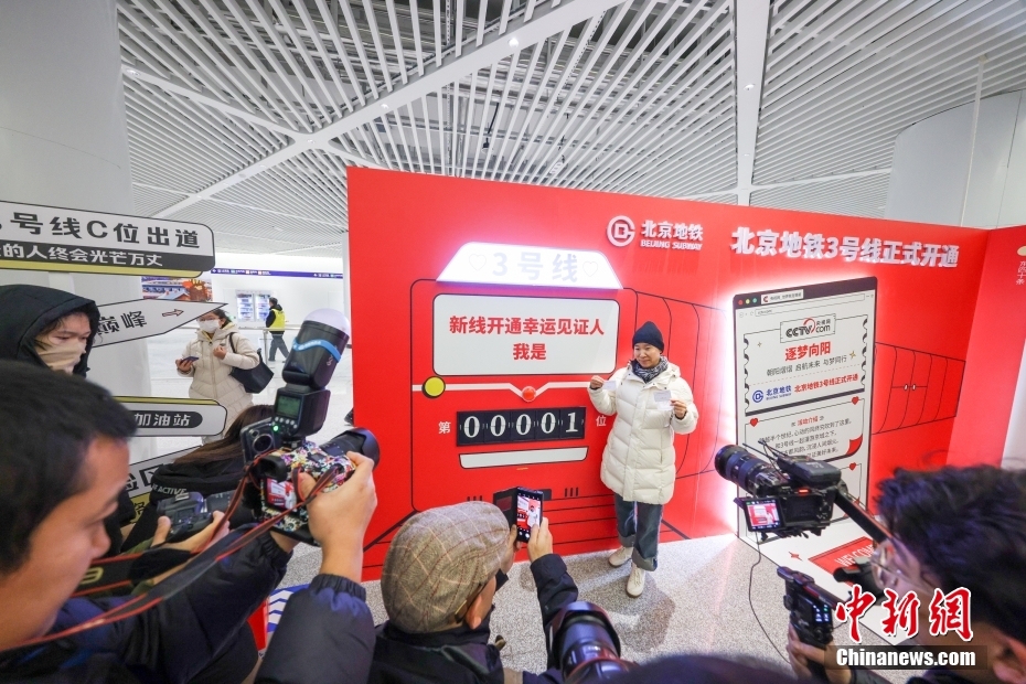 北京地铁3号线朝阳站内,拿到001号纪念车票的乘客在打卡拍照。