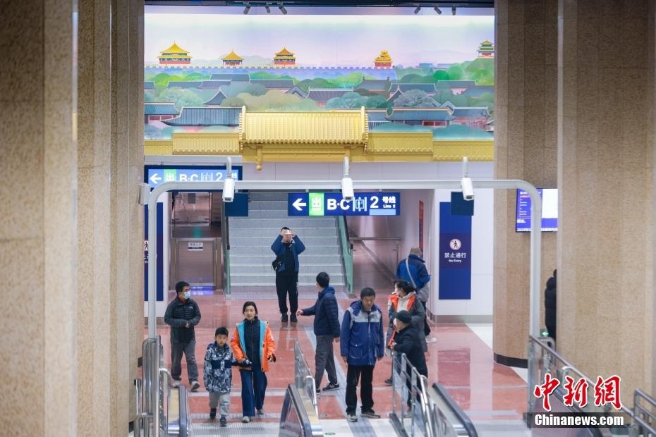 乘客在北京地铁3号线工人体育场站内打卡拍照。