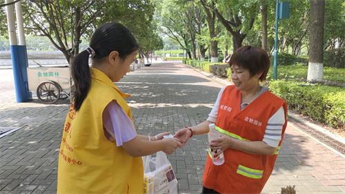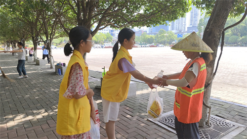 启动仪式现场环节结束后,同学们15人一组在家长和志愿者带领下手拿矿泉水和藿香正气液等防暑物品前往星沙城区多个户外工作岗位,亲手将这份心意传递给每一位坚守在岗位上的劳动者。孩子们的行动不仅为户外工作者带去了一丝凉意,更传递了社会对他们无私奉献的感激之情。“还有两天就起伏了,谢谢你们每年都在最热的时候及时给我们送来了矿泉水和防暑物品!”环卫师傅蒋时习接过水和藿香正气液激动地连声道谢。