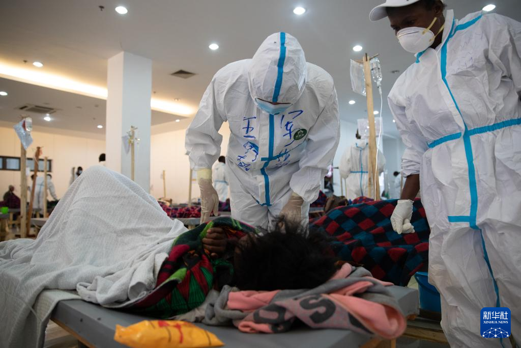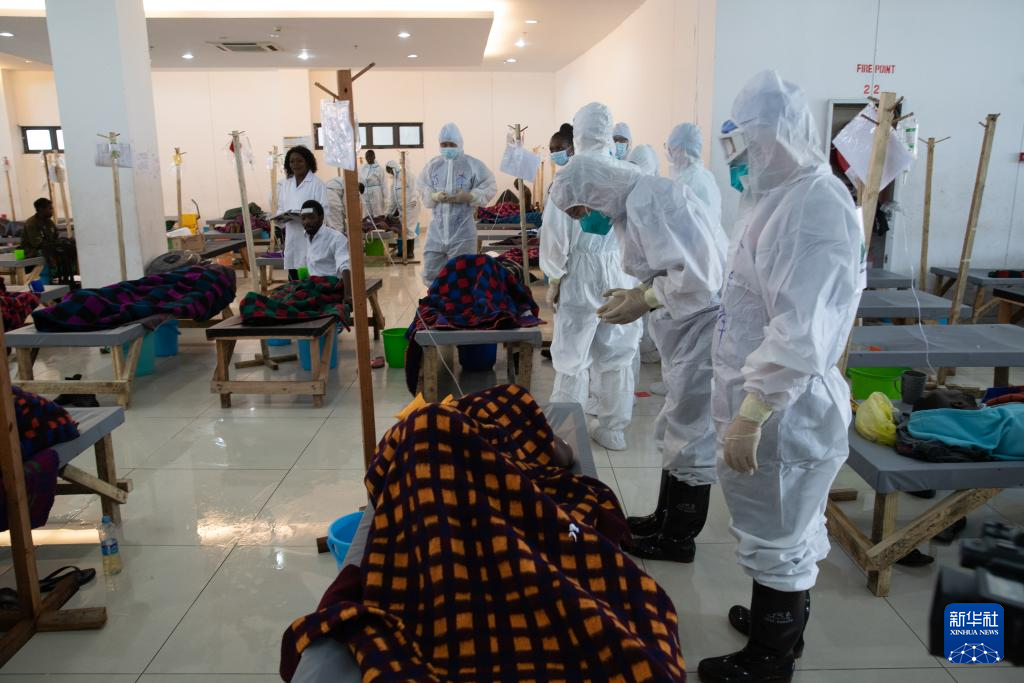 1月18日,在赞比亚首都卢萨卡的国家英雄体育场临时霍乱救治中心,中国医生和当地医生检查霍乱患者情况。