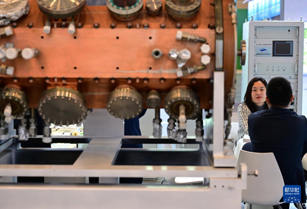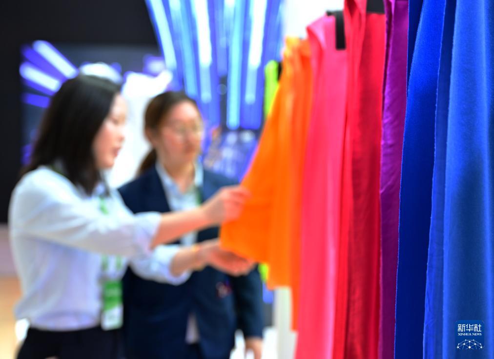 4月9日,观众在鞋服展位上了解福建浔兴拉链科技股份有限公司的最新无水染色技术生产的布料。