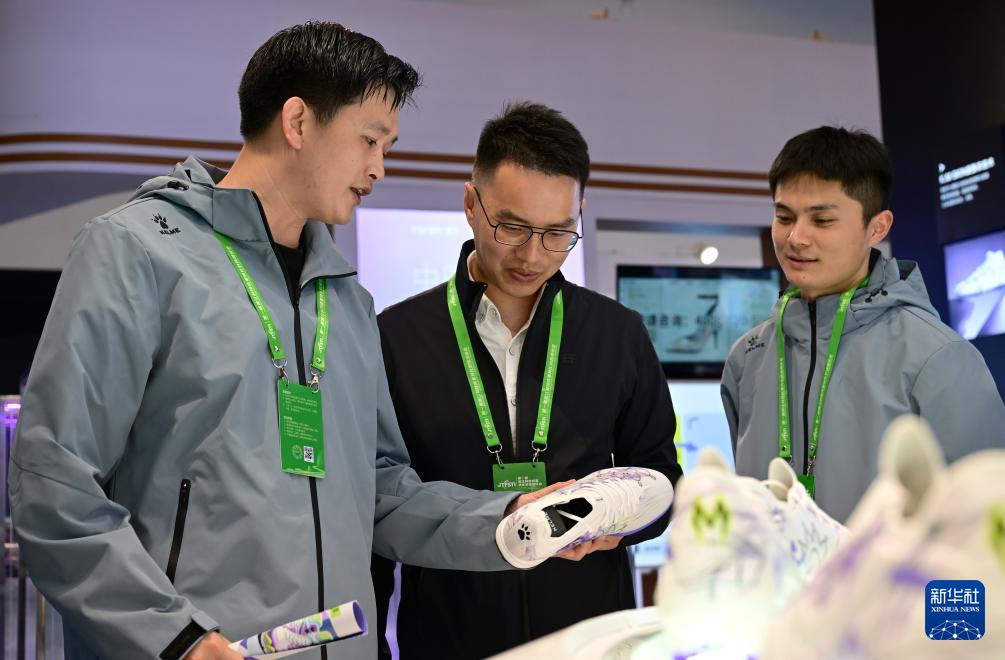 4月9日,在首届晋江科技成果转化对接洽谈会鞋服展位,专业参展商(中)在了解球鞋的生产工艺。