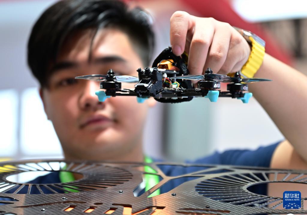 4月9日,在首届晋江科技成果转化对接洽谈会智能装备展位,工作人员在展示无人机研究成果。