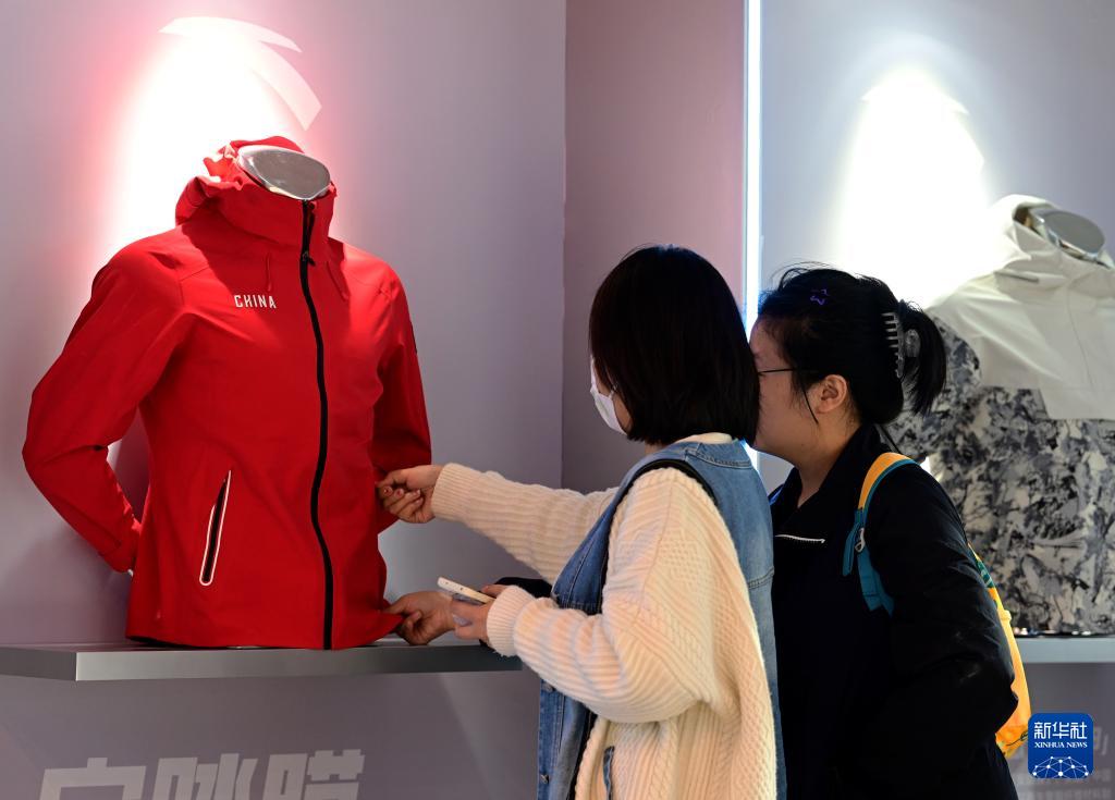 4月9日,两名专业参展商在安踏展位上了解“安踏风暴甲”防暴雨级冲锋衣。