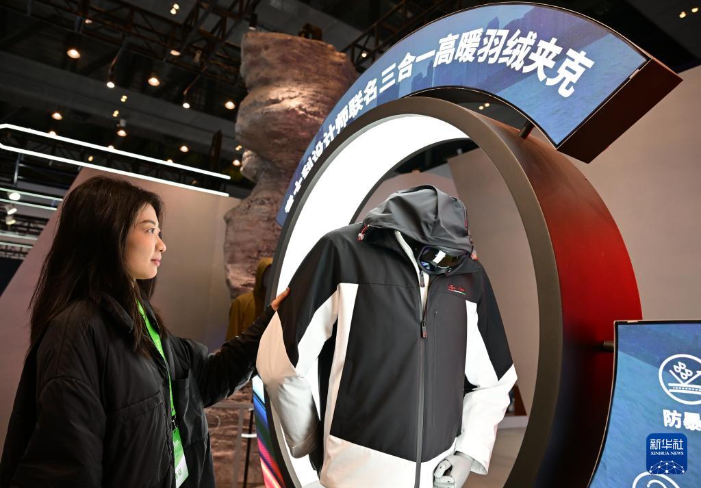4月9日,一名观众在鞋服展位上了解一款意大利设计师设计的三合一高暖羽绒夹克。