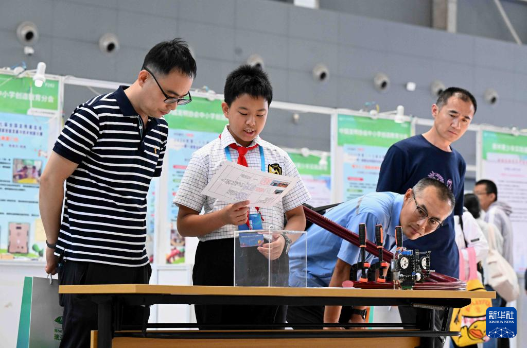 5月22日,在第27届全国发明展览会现场,一名小朋友(左二)介绍自己的发明创造情况。