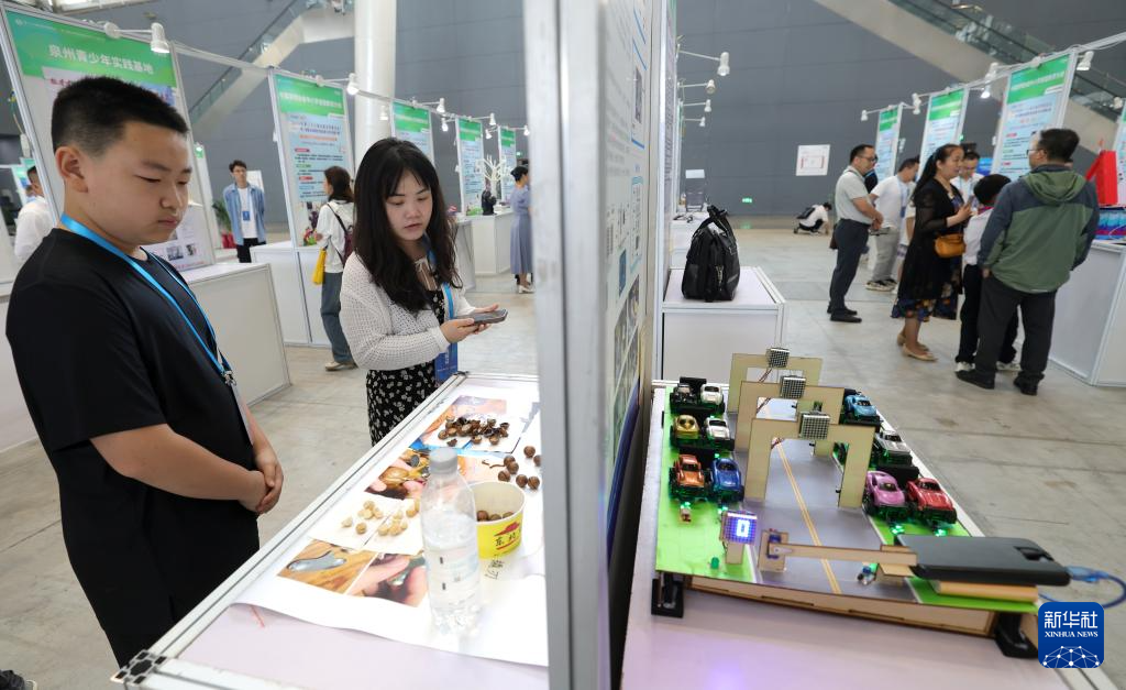 5月22日,小朋友在第27届全国发明展览会现场参观。