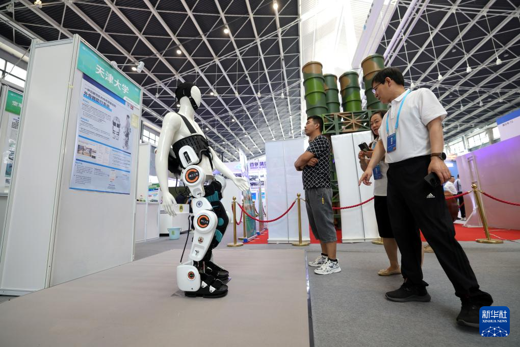 5月22日,在第27届全国发明展览会现场,人们在观看一款“外骨骼行走助力器”。