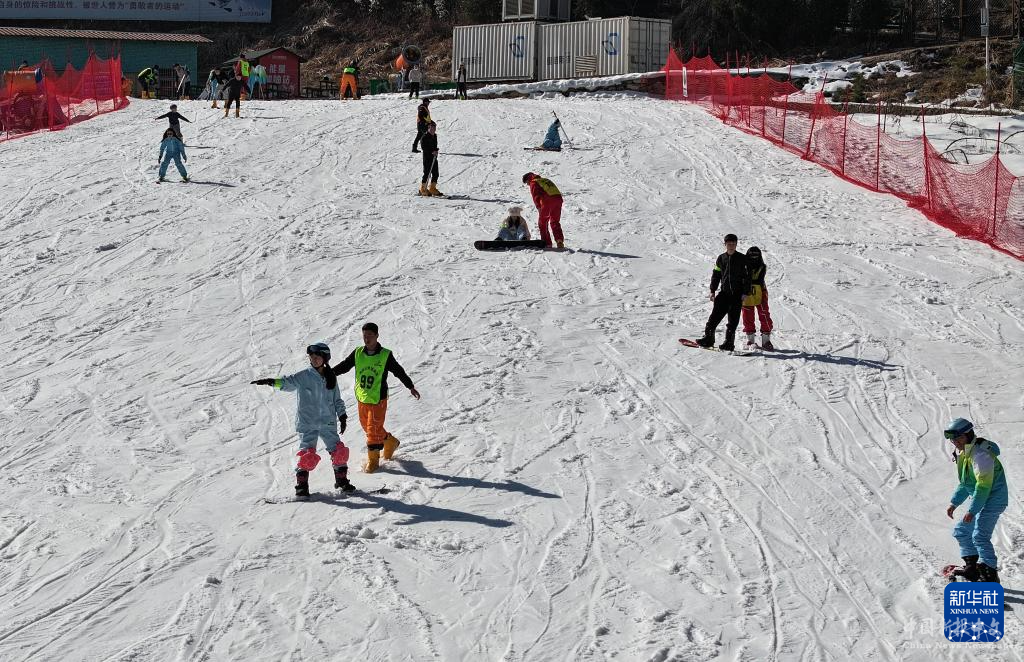 1月6日,游客在潜山市水吼镇天柱山滑雪场体验滑雪(无人机照片)。