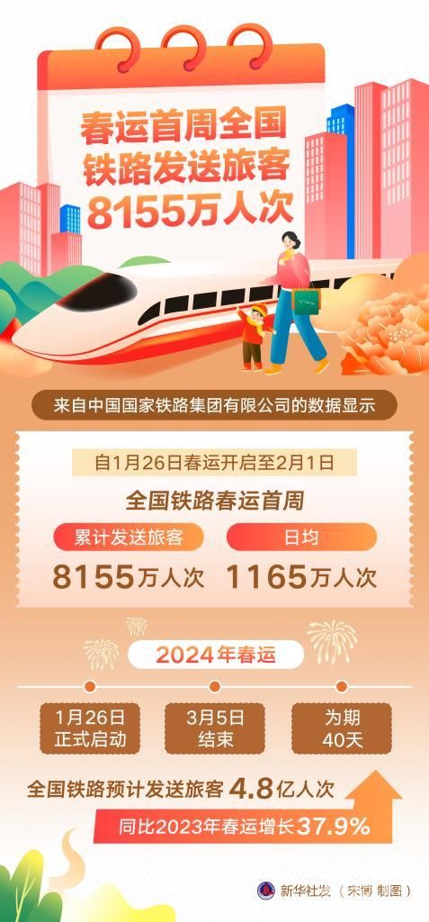 新华社北京2月2日电(樊曦、唐嘉雨)2日,2024年春运度过首周。来自中国国家铁路集团有限公司的数据显示,自1月26日春运开启至2月1日,全国铁路春运首周累计发送旅客8155万人次,日均1165万人次。