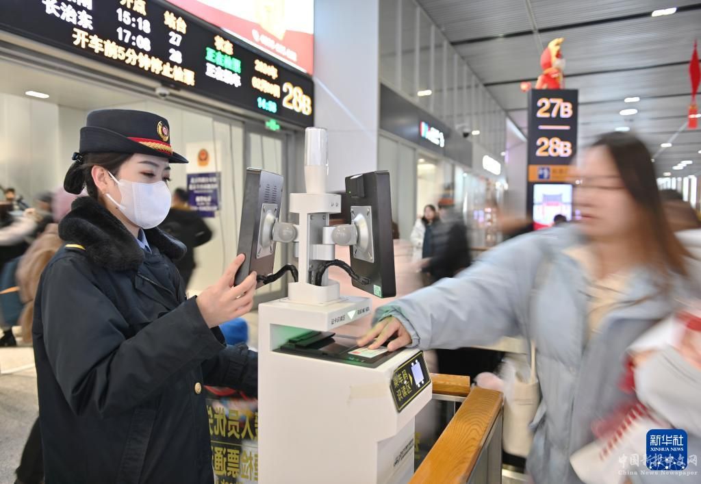 2月3日,北京丰台站的工作人员协助旅客刷身份证检票。