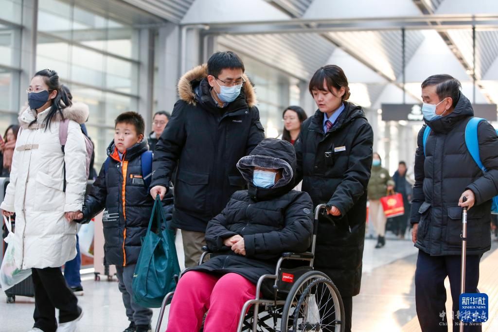 2月3日,在北京丰台站,乘坐从晋城东到北京丰台G684次列车的旅客在工作人员帮助下出站。