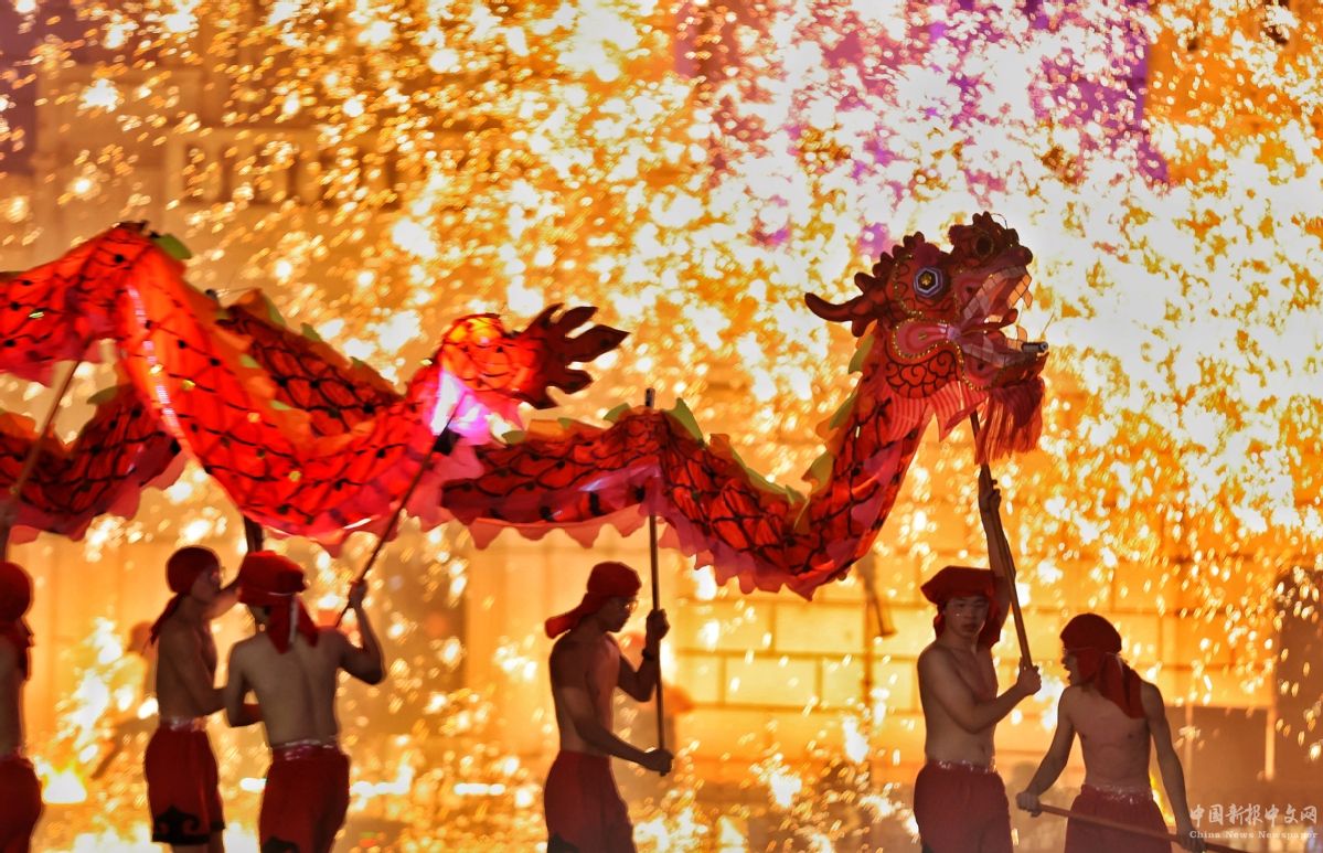 2月4日晚,民间艺人为游客表演“火龙钢花”。中国日报记者 姜东 摄