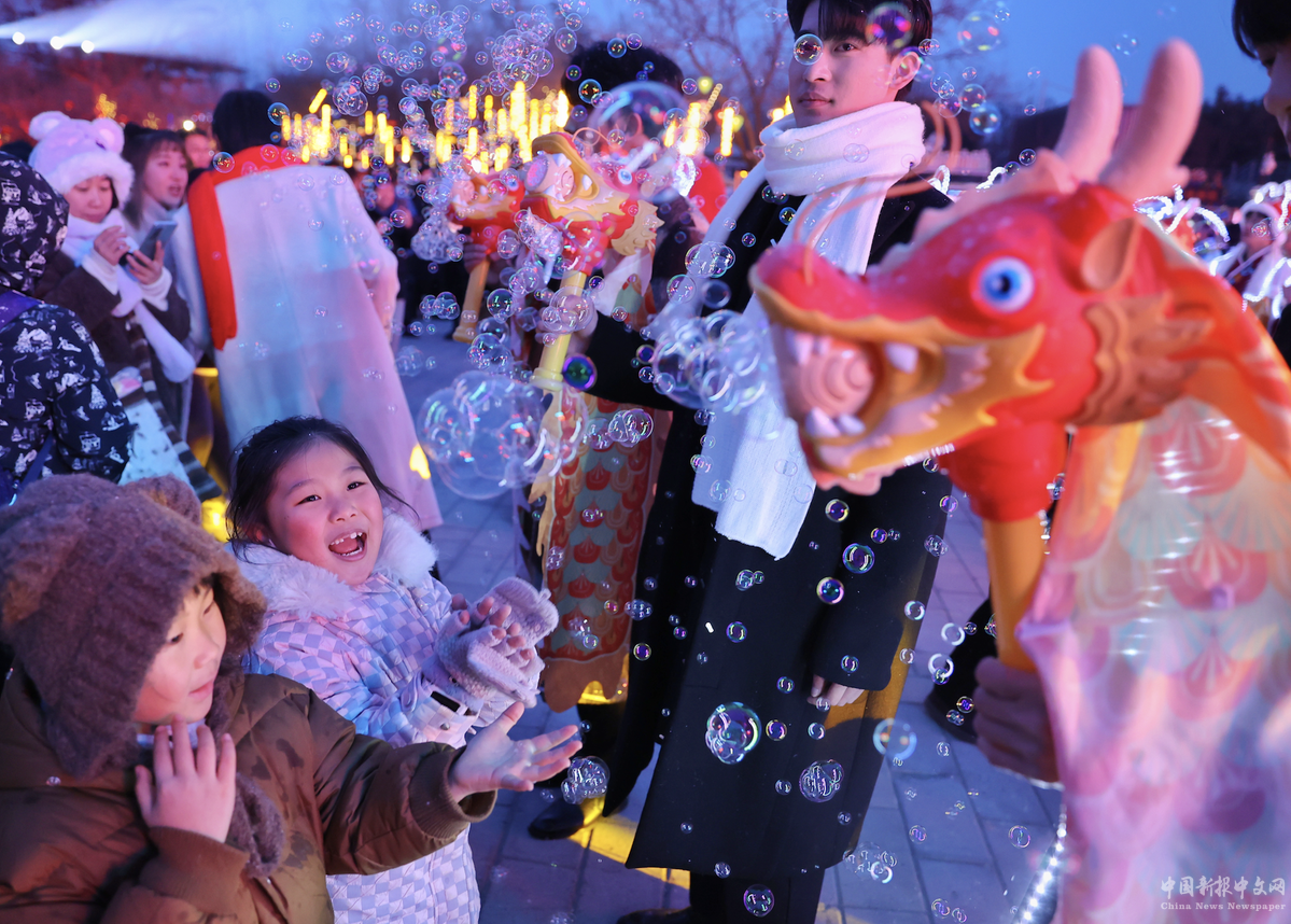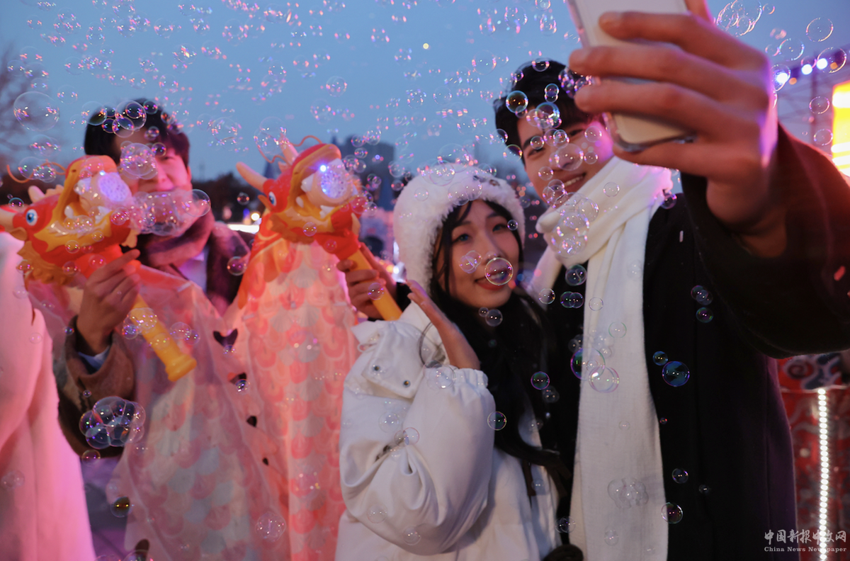 2月4日晚,年轻人手持龙型泡泡机游园。中国日报记者 姜东 摄