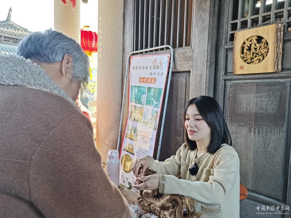 2月11日,陈嘉在木雕展位前为游客介绍产品。新华社记者詹奕嘉 摄