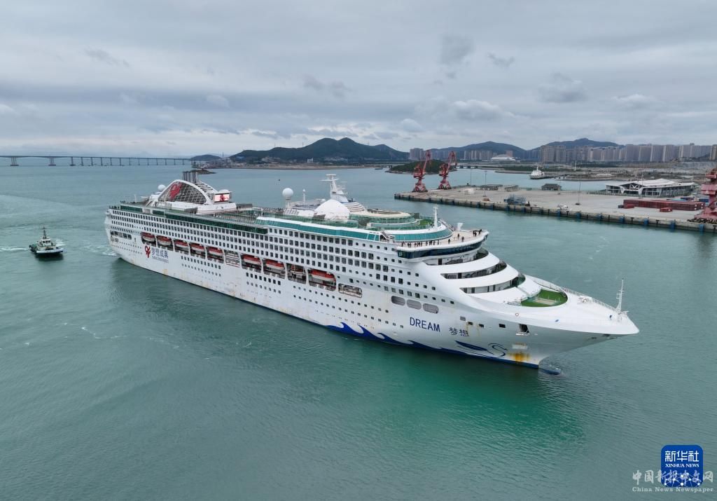 3月6日,“梦想”号国际邮轮离开平潭国际邮轮中心码头(无人机照片)。